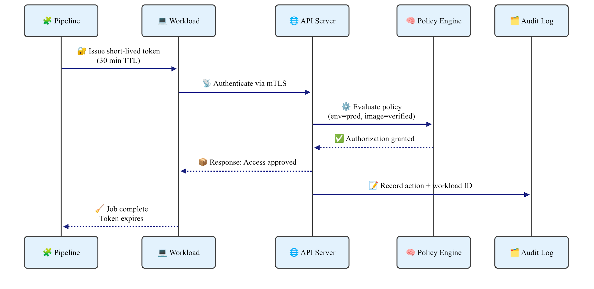 Authorization: Policy evaluates: namespace=production AND image_signature=verified AND owner=platform-team → ALLOW