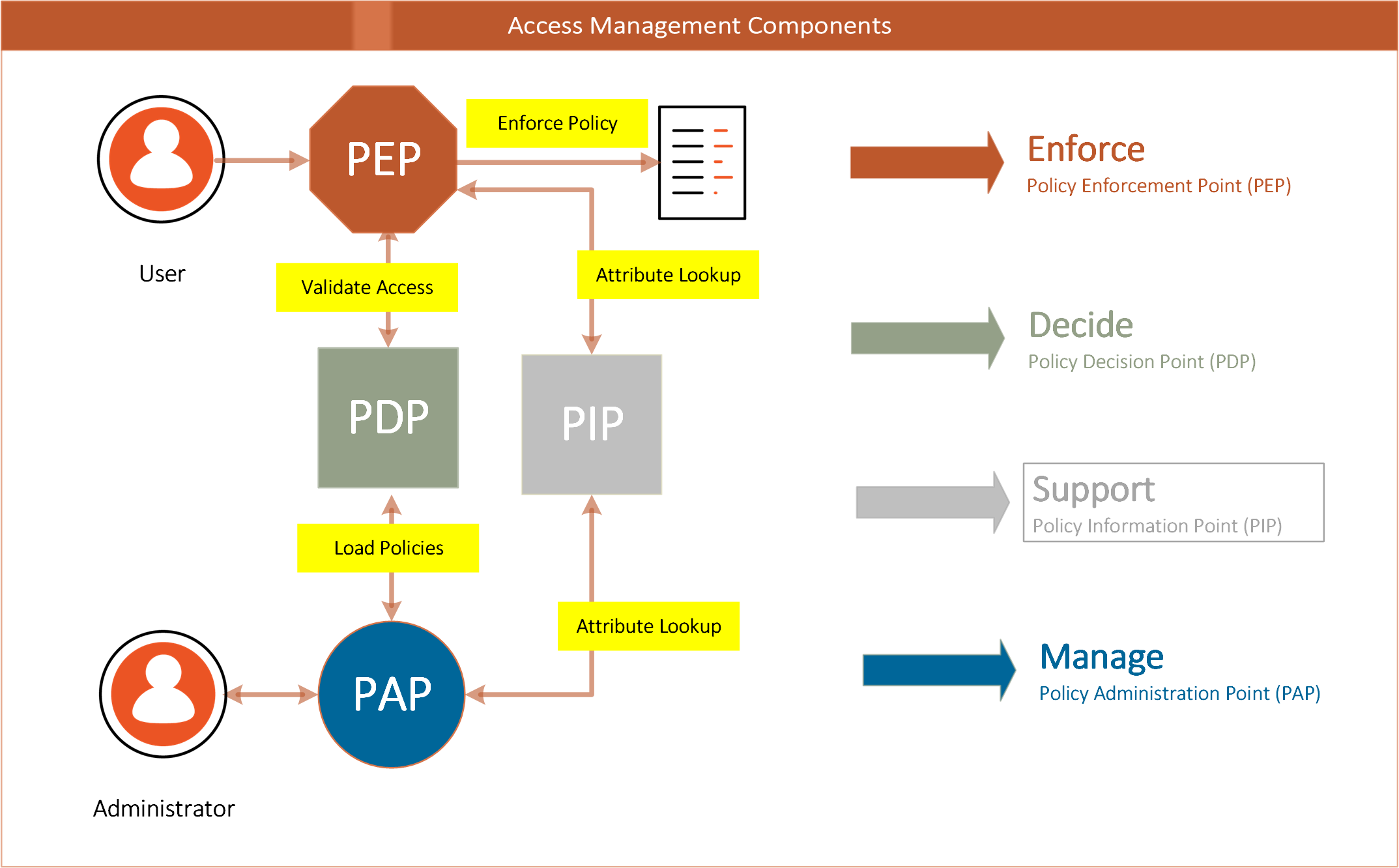 | Policy Information Point (PIP) | typically a user or attribute store that provide information about managed users (e.g., Active Directory or LDAP directory) |