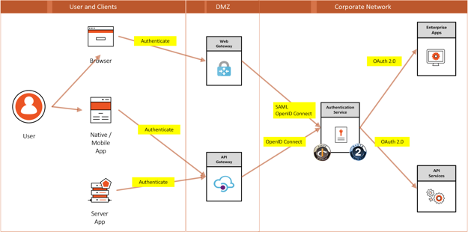 The architecture of an authorization service will typically contain the key elements that are involved in the flow from an actor (person or system) on a device (mobile or desktop) that accesses an application or service (typically over the internet) that resides within an enterprise boundary (behind network firewalls).